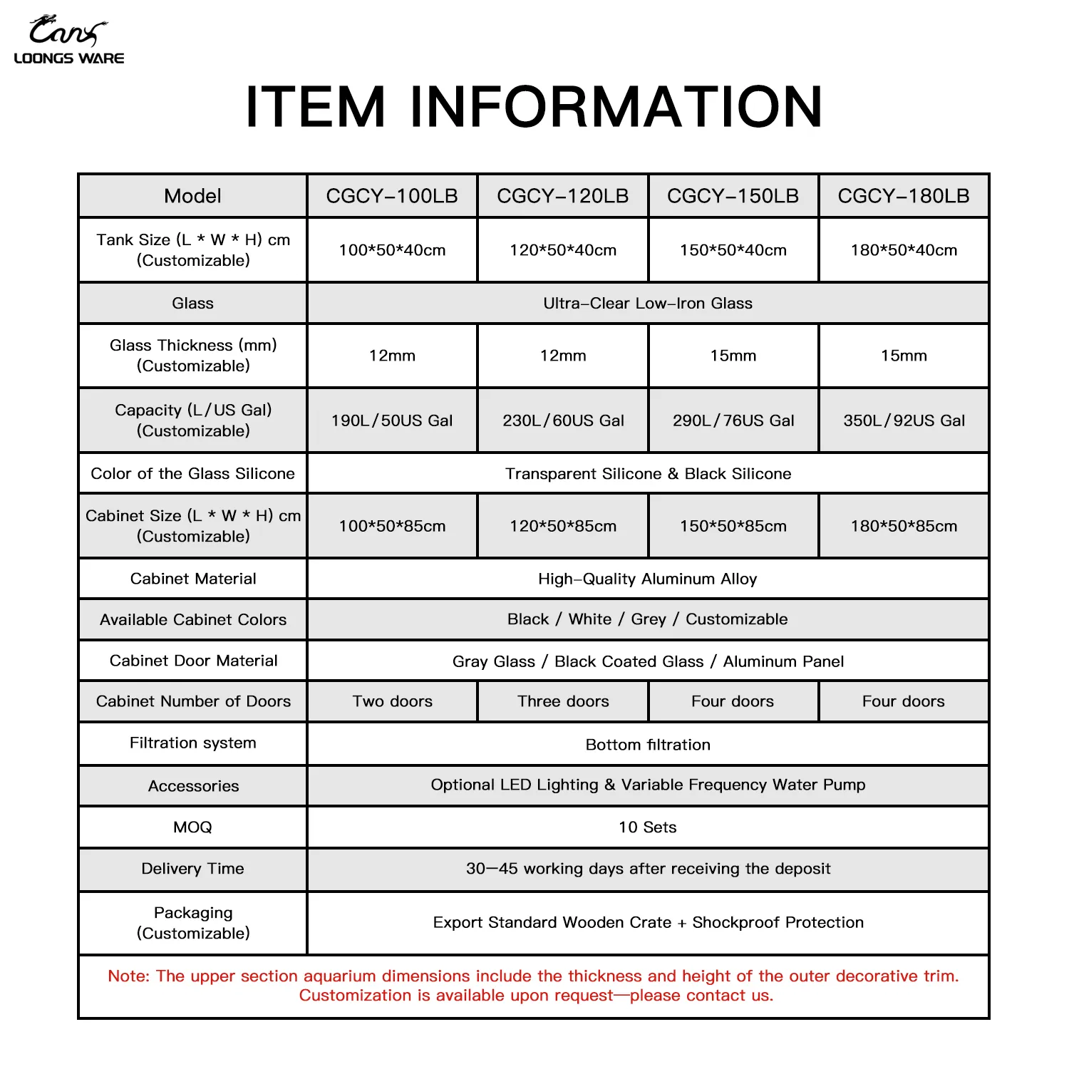 Detailed parameter chart of stream aquarium tank for professional buyers.